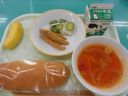今日の献立は、米粉コッペパン、牛乳、きびなごのさくさく揚げ、かぶのサラダ、トマトスープ、バナナ です。