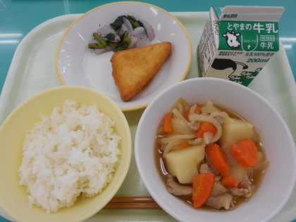 本日の献立は、肉じゃが、はんぺんフライ、ゆかりあえ、です。
