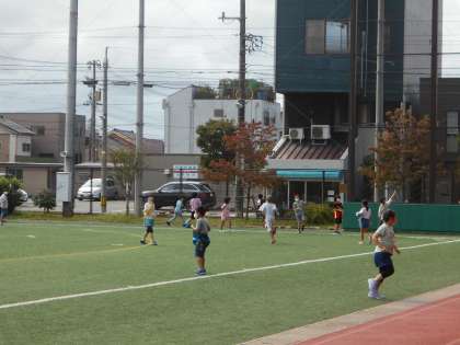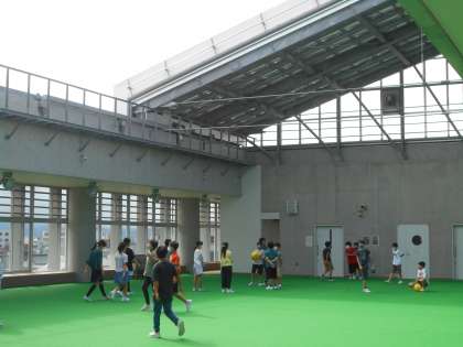 日中には雨も止み、グラウンドで楽しく鬼ごっこをする子供たち。室内プールでは天井を開け換気をよくして、6年生が遊んでいました。