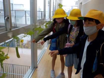 4月から育ててきたヘチマが、実を付けています。子供たちが毎日水やりを続けているグラウンドのヘチマは、とても大きな実を付けています。また、廊下のヘチマも実を付けました。これには子供たちもびっくりです。今後、ヘチマの実はどうなっていくのか、とても楽しみにしている子供たちです。