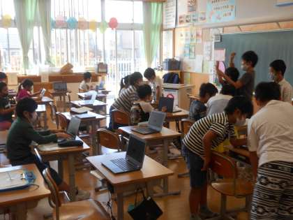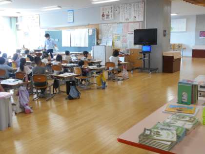 中は3年生が端末の操作を教え合う光景、右は2年生の国語の授業風景です。2年生は「ふたりはともだち」という心温まる友情物語を学習しています。教科書にはその一作品が載っていますが、実はこの本はシリーズ化しており、それらの本を図書室から借りて学年コーナーに並べています(右端に映っています)。教科書の作品から、同じ作者、シリーズ、関係本へと読書を発展させていくことも、本好きの子供を育てるのに有効なようです。