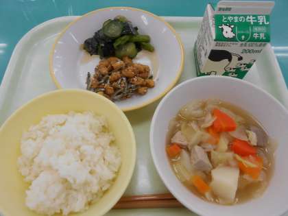 今日の献立は、ごはん、牛乳、小魚入りフライビーンズ、海藻サラダ、ポトフ です。