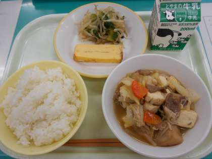 今日の献立は、ごはん、牛乳、厚焼き卵、おひたし、すきやき です。