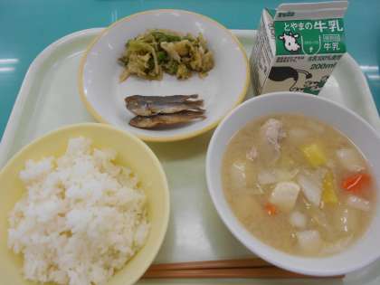 今日の献立は、ごはん、牛乳、小あじのから揚げ、ごま和え、さつま汁 です。