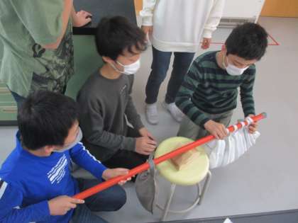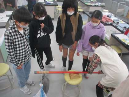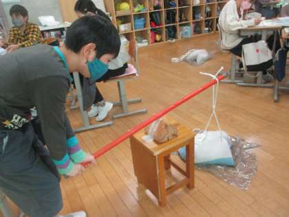 支点、力点、作用点の位置を変えて、手応えの変化を調べました。