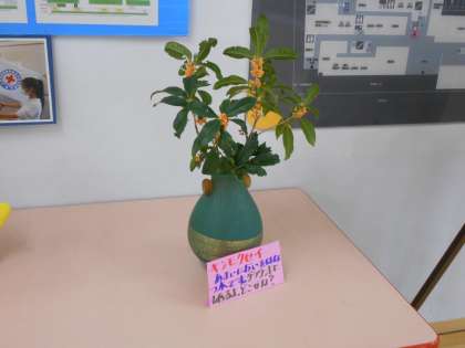 職員が玄関にキンモクセイを飾ってくれました(右)。実は学校にも木があることを発見しました。さて、甘いにおいはどこから?