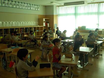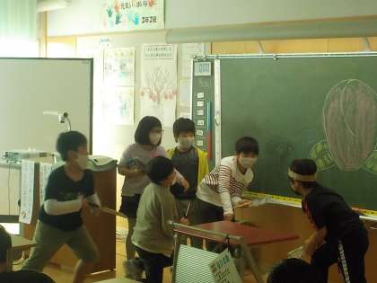 今日は、お笑い・劇係による「桃太郎」の劇の発表がありました。工作係の作った小道具を使い、役になりきった演技を見て、子供たちも笑顔になりました。