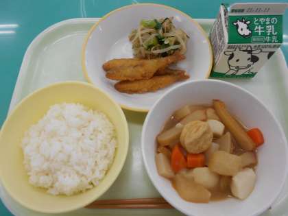 今日の献立は、ごはん、牛乳、わかさぎのフリッター、昆布和え、おでん です。