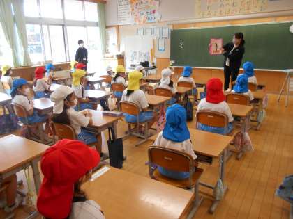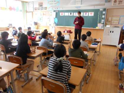 左は3年生の外国語活動、中は1年生が朝活動を利用して、「グー・ペタ・ピン」のよい姿勢について養護教諭から指導を受けているところです。先日の学校保健委員会で学んだことを委員会の子供を中心に全校へ広げます。