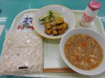 今日の献立は、ソフト麺(肉みそかけ)、大学いも、花野菜サラダ、味付け小魚、飲むヨーグルト です。