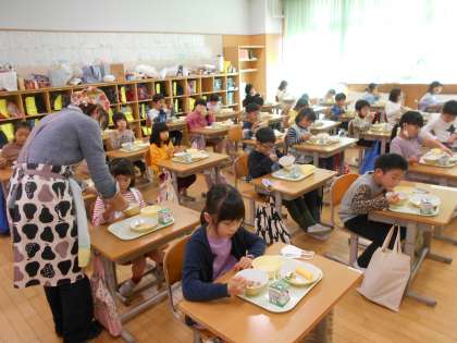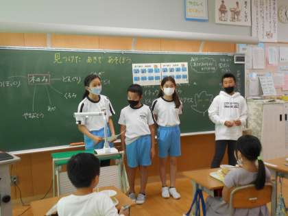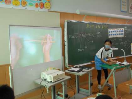 給食委員会の5年生が1年生教室で「はしの持ち方」のお話をしました。これまで給食時間に音楽に合わせてはしの持ち方を練習する「おうまのおめめ」を流していましたが、1年生に直接教える機会は今回がはじめてです。モニターに手元の映像を映すなどの工夫がされていました。