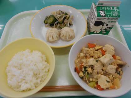 本日の献立は、炒り豆腐、えびパオツ、きゅうりとわかめの酢の物、です。