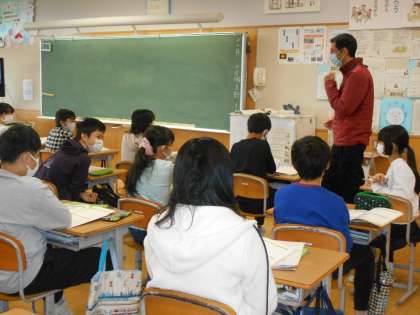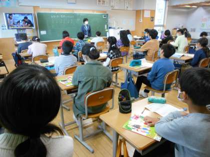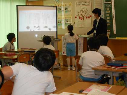 そして右は、3年生の国語の説明文「すがたをかえる大豆」の研究授業です。つなぎ言葉等に着目して、真剣に話し合っている姿が印象的でした。