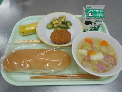 今日の献立は、コッペパン、牛乳、豆とかぼちゃのコロッケ、大根サラダ、キャベツスープ、棒チーズ、バナナ です。