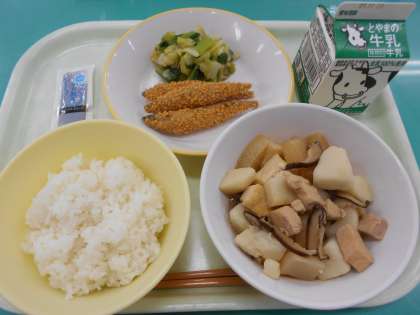 本日の献立は、里芋と厚揚げのうま煮、きびなごのサクサク揚げ、梅肉和え、のりの佃煮、です。