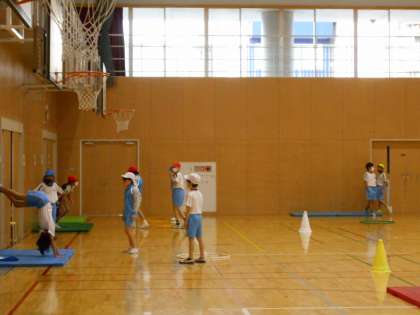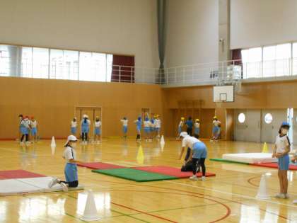 残り2枚は、5年生の体育のマット運動です。自分が目指す技に沿って練習場所を選び、友達同士で声をかけ合って練習しています。お家の布団でも練習している姿が想像できます。