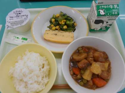 本日は「学校給食とやまの日」の献立です。しいら、小松菜、えごまの葉をはじめとする、9つの食材が富山県内で育てられたものです。地元富山で栽培や水揚げされている食べ物を知るいい機会になりました。