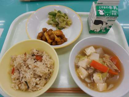 本校の献立は、ひじきご飯、いかと豆のカレー揚げ、グリーンサラダ、豆腐のスープです。