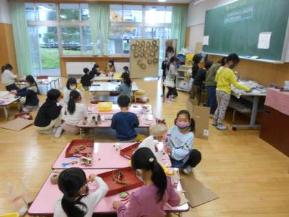 右は、1年生の生活科で秋の贈り物を使っておもちゃをつくっています。