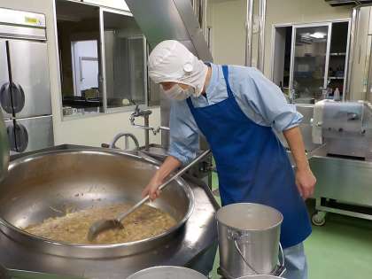 「とんこつラーメン」は豚肉、にんじん、もやし、白菜、きくらげ、ねぎの具材がスープに入っています。写真(下)はスープを配缶しているところです。