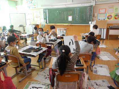 4年生は育ててきた「ヘチマの今」に大興奮(中)し、3年生は書き初め直前の習字(右)に取り組んでいました。