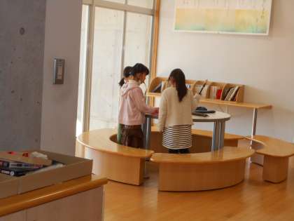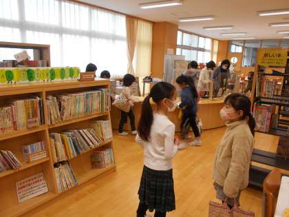 写真は図書室を利用する2年生(左)、学級のクリスマス集会に向けた練習をする3年生(中)です。6年生は体育でバレーボールに挑戦しているようです(右)。