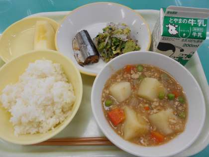 本日の献立は、ゆかり和え、ジャガイモのそぼろあん、さんまの生姜味、りんご、です。