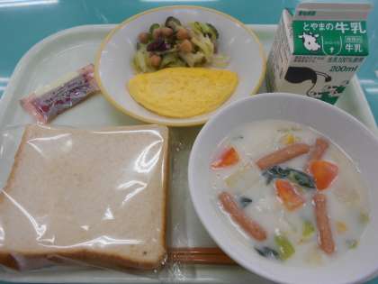 今日の献立は、食パン、牛乳、オムレツ、ビーンズサラダ、クリーム煮、メープルジャム です。