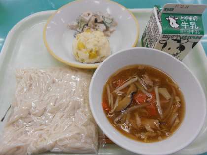 今日の献立は、ソフト麺、牛乳、五目あんかけ、蒸しパン、れんこんサラダ です。