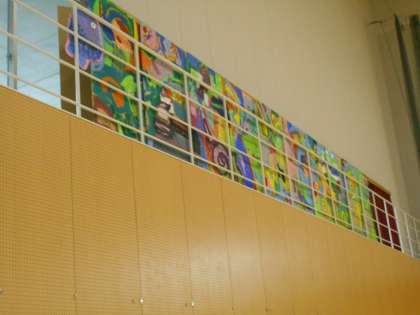 先日の段ボール迷路に6年生が書いた絵は、体育館後方に飾ってあります(右)。