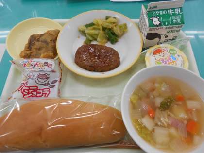 今日の献立は、コッペパン、牛乳、「魚の香草フリッター」または「照り焼きハンバーグ」、アスパラサラダ、ひよこ豆のスープ、「ガトーショコラ」または「豆乳プリン」です。