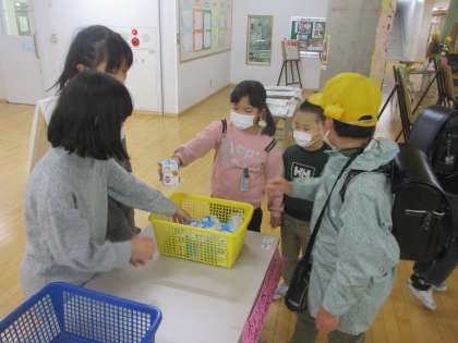 今週月曜日から水曜日に、募金を行った児童がお金を学校に持ってきました。児童玄関前に立つ環境委員にドラえもんの募金箱を渡していました。