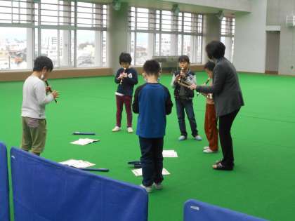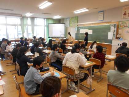 5年生では算数で平行四辺形の面積の求め方(中)、3年生は音楽でリコーダー練習(右)をやっていました。