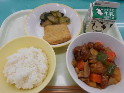 本日の献立は、酢豚、信田巻き(野菜とすり身の油揚げ巻き)、わかめサラダ、です。