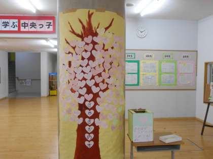 2学期セントラル委員会を中心に取り組んできた「ぽかぽか言葉の木」が右の写真のようになりました。あいさつも含め、悲しい思いをしているときに「大丈夫!」、一人でいるときに「一緒に遊ぼう」といったように勇気付けたり元気づけたりして「心がぽかぽかするような言葉」の花がこんなに咲きました。