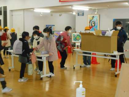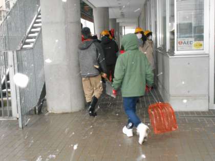 雪が降り積もり、登校した6年生から除雪をしてくれた13日(木)の朝です(左=除雪道具を片付ける6年生)。玄関では、6年生が総合で2学期末から全校に呼びかけていた発展途上国へ送る物品を回収していました(中。案内は2学期末、子供向け文書で配布済)。