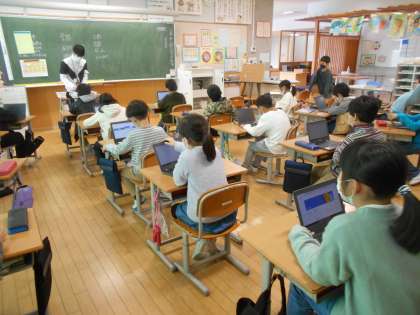 右は、3年生が端末を使って係活動を決めている光景です。