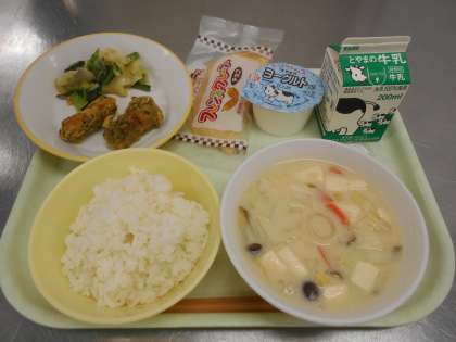 今日の献立は、ごはん、牛乳、ちくわのカレー揚げ、しょうがひたし、豆乳汁、ヨーグルト、チョコクレープ です。