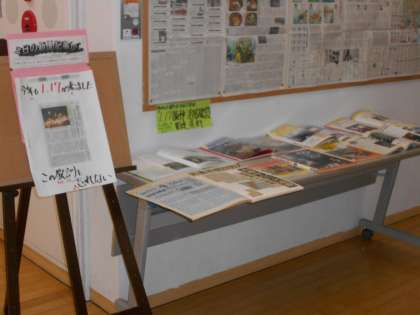 さて、左は昨日も紹介した児童玄関の「1,17特設コーナー」です。
