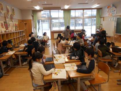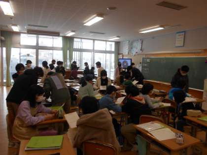 右は6年生の英語で「思い出を紹介する」様子です。その6年生に対して、「習字で卒業を祝う」「祝う会の出し物」の各クラスの話合いが始まっています。季節を感じます。