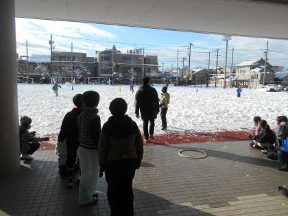 昨日は、晴れ間を見て4年生が体育で「雪中活動」を行っていました(左)。