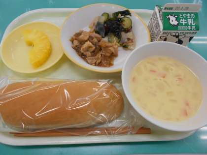 本日の献立は、あっさりチキン、海藻サラダ、野菜のポタージュ、カットパイン、です。