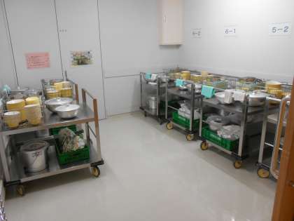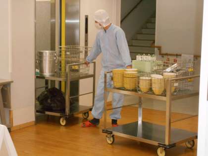 給食後の運搬車は調理員さんがエレベーターを使って運びます(左=片付けた運搬車、中=片付ける調理員さん)。