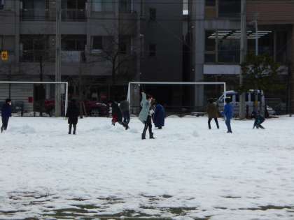写真は、昨日の「なかよしタイム」に雪遊びをする4年生です。あんなに積もった雪も随分少なくなりました(右)。