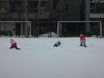 写真は、金曜日の休み時間にグラウンドで雪遊びをする子供たちです(右)。