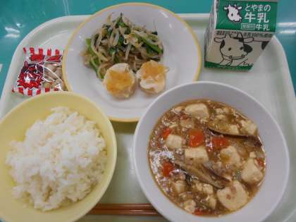 今日の献立は、ごはん、牛乳、マーボー豆腐、にんじんシューマイ、おひたし、節分豆 です。