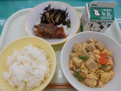 本日の献立は、魚の甘味噌かけ、ひじきと小松菜の炒め煮、高野豆腐の卵とじ、です。
