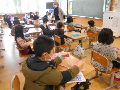 算数で長さの学習をしている2年生は、紙テープを使いながら学んでいました(右)。算数の世界には「量感」という言葉があります。「1mとはどれぐらいの長さか?」を知っていることです。そう考えると、生活と算数は結びつきます。