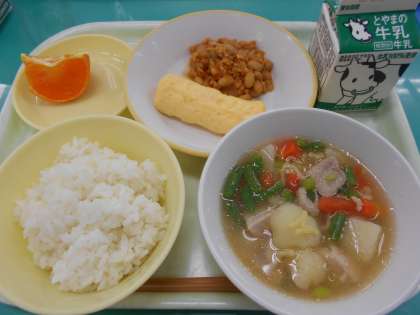 本日の献立は、卵ロール、白インゲン豆のトマト味、野菜のスープ煮、甘平です。