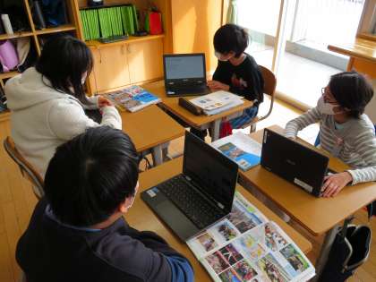 そして、調べたことを班の仲間に伝えました。4人とも調べた国が異なるので、話すときも聴くときも目的意識を高くもつことができました。
